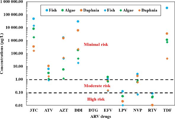 Over the years, considerable attention has been devoted to the investigation of the toxicity of ARVs in mammalian systems (Carr and Cooper, 2000; Hawkins, 2010). It is only in recent times that research has started to elucidate the ecotoxicity of these pharmaceuticals, a factor that contributes to the limited availability of ecotoxicity data for ARVs (Olabode and Somerset, 2019) The toxicity of ARVs toward aquatic organisms, such as fish, algae, daphnia, and bacteria, is classified among the top ten most toxic categories of pollutants (Sanderson et al., 2004). However, only a limited number of studies have reported toxicity data such as acute and chronic endpoints or sub-lethal effects across different levels of biological organization Table 1. Moreover, existing findings are often inconclusive, largely because most experiments were conducted in synthetic media rather than environmentally relevant conditions. This paucity of hazard characterization underscores an urgent need for systematic ecotoxicological assessments of ARVs in non-target species. Although extensive data exist on the environmental occurrence of ARVs across various matrices (Table S1-S5), there remains no clear risk assessment framework addressing their potential impact on ecosystem integrity or human health through exposure pathways such as food or drinking water. For instance, ARVs have already been detected in drinking water supplies (Wood et al., 2015), yet no regulatory threshold values have been established to guide safety evaluations.
