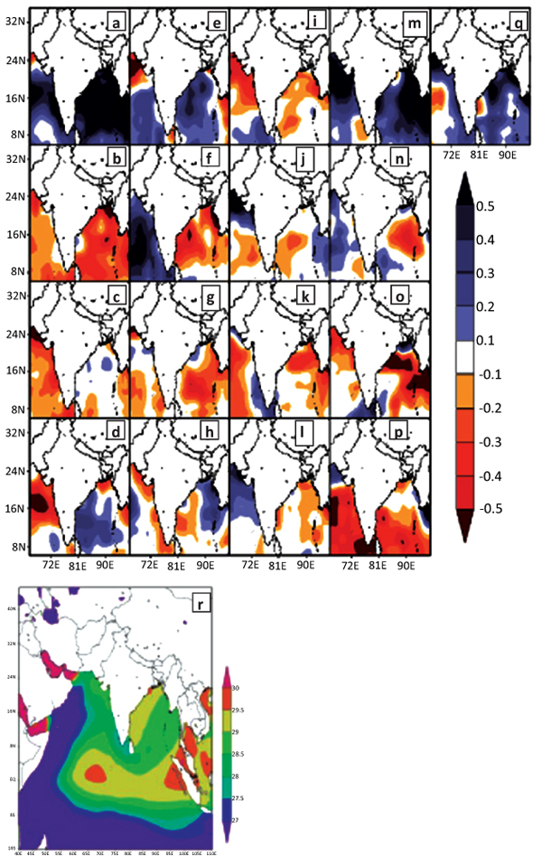 The wind anomalies from 1998 to 2014 are shown in Fig. (3a to q, r) shows climatologically wind pattern across Indian sub-continent, which appears to be turning to Indian region from the Bay of Bengal. These panels of wind anomalies demonstrate how every year wind carries a substantial greenhouse gas emitted from the ocean. To further demonstrate the importance of warmer sea surface temperature in relation with CO2, Figs. (4a to q) displays the NOAA OISST anomalies from 1998 to 2014. Fig. (4r) illustrates the climatological Sea Surface Temperature (SST) for summer monsoon around Indian region. Most of the time, SST over the Bay of Bengal remains quite high. The factors of intense wind and warm SST help to enhance the upward CO2 flux over the Bay of Bengal region. CO2-laced monsoonal winds enter Indian region during the summer, a season when Indian farmers start to sow the crops of rice and maize. Elevated CO2 and global warming may affect the yield of rice production.