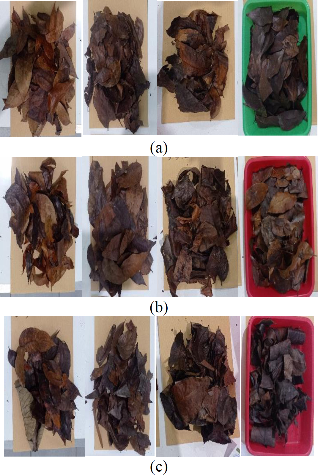 The process of leaf litter decomposition can be seen directly by observing the color changes of the leaves along with changes in their physical structure (Fig. 2). The initial stage of litter decomposition is the occurrence of physical changes in the litter, which will become more intensive over time (Karina et al., 2022). Color changes in leaf litter can occur due to the breakdown of the green leaf substance (chlorophyll) in the leaves, which were originally green, turning yellow, brown, and changing to other darker colors (Berg & McClaugherty, 2008). Physical changes in leaf litter during observation did not show any striking changes (Fig. 2). However, the structure of the litter began to become brittle and break and crack. Changes in litter structure are presented in Fig. (2a) (monoculture), Fig. (2b) (polyculture), and Fig. (2c) (agroforestry). Damage to the leaf litter structure on monoculture and agroforestry is more visible when compared to damage to the leaf litter structure on polyculture land. Siagian et al. (2021) stated that the decomposition process will change the structure of leaf litter to become more brittle and then form flakes.