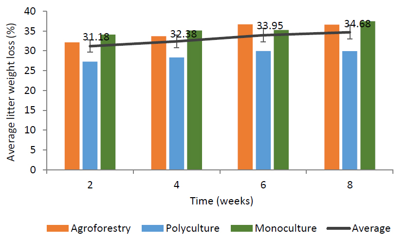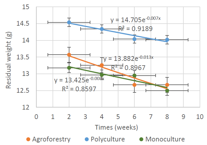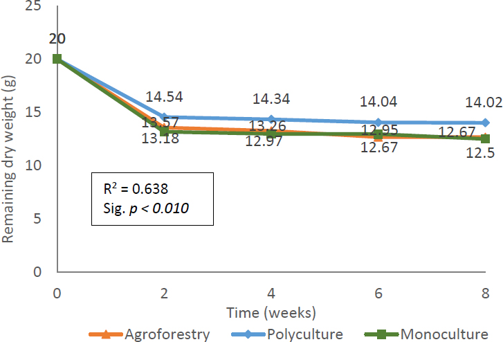 Polyculture community forests with environmental conditions that are almost similar to agroforestry forests tend to experience the slowest decrease in litter weight (Fig. 4). The decrease in litter weight is only 28.85% of its initial weight (Fig. 3). This is due to the dominance of stands with low litter quality so that they are difficult to decompose. These stands include: mahogany, teak, and acacia. Susanto et al. (2021) stated that the loss of litter weight is caused by differences in litter chemistry.