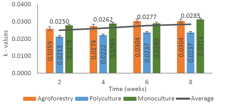 The rate of leaf litter decomposition in several forms of community forest land management is presented in Fig. (5). The litter decomposition rate was illustrated by the decomposition constant (k). The results of the analysis show that the average decomposition rate is 0.0268. The highest decomposition rate is on land with a monoculture planting pattern of 0.0293, then in an agroforestry planting pattern of 0.0277, and the smallest decomposition rate of 0.0229 in community forests with a polyculture planting pattern (Fig. 5). The decomposition rate is influenced by environmental conditions such as vegetation, temperature, air humidity, and rainfall. [16] Vegetation density and the amount of rainfall are the main factors causing high or low temperatures and air humidity in an area.