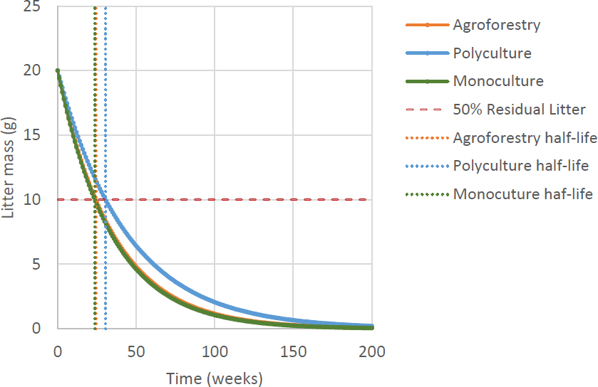 Based on the exponential equation created, the decomposition process in the litter in the Pracimantoro karst community forest cannot be predicted when it will reach zero. However, the reduction in the weight of the remaining litter can be estimated using half-life calculations. Siagian et al. (2021) said that an R-square value of more than 0.5 indicates a good relationship between the two variables. The decay of the remaining weight of the litter is suitable to be presented in an exponential graph because the initial process of weight loss will be greater and slow down over time (Mahmudi et al., 2011). Nurjanto et al. (2016) stated that the magnitude of the decrease in litter weight is never constant but always changes over time. From the equations obtained from the three forms of community forest management, it can be estimated that the cycle of decreasing the remaining weight in the litter decomposition process from monoculture forests, polyculture forests, and agroforestry sequentially occurs every 23.64 weeks, 30.52 weeks, and 24.31 weeks (Fig. 7). The smaller the half-life value, the faster the decomposition process will take place. Zhu et al. (2021) stated that the average litter in tropical forests throughout the world will decompose for 0.50 - 3.03 years. However, leaf litter experienced variations in decomposition time between 1 - 5 years (Prescott, 2010).