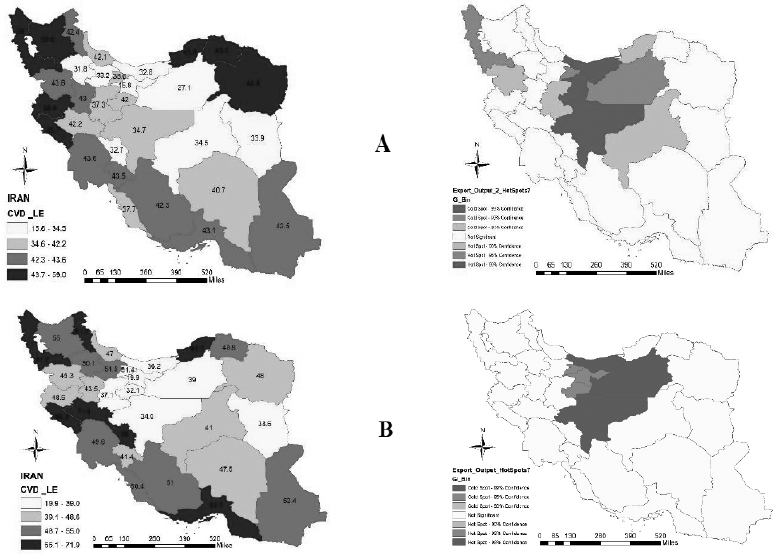 Geographical distribution of cardiovascular mortality rates attributable to lead exposure in Iran, 2021 (A: Women, B: Men).