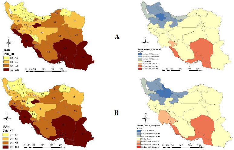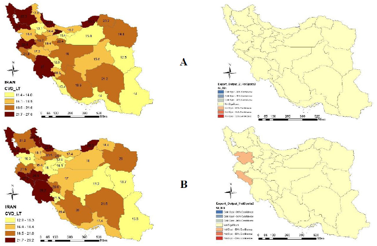 The spatial distribution and clustering of CVD mortality rates were assessed using Moran's I and Getis-Ord Gi* statistics to identify spatial autocorrelation between provinces. Moran's I range from +1 (perfect positive spatial autocorrelation or clustering) to -1 (perfect negative spatial autocorrelation or dispersion), with 0 indicating no spatial autocorrelation. The lowest mortality rates were observed in the first quarter, while the highest rates were observed in the fourth quarter. The spatial distribution of mortality rates was visualized using ArcMap GIS software version 10.2. A significance level of 0.05 was used for all statistical tests (Soodejani et al., 2019).