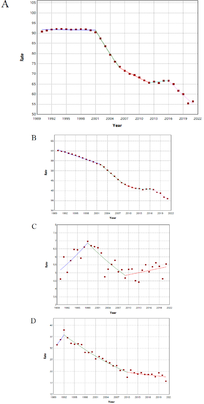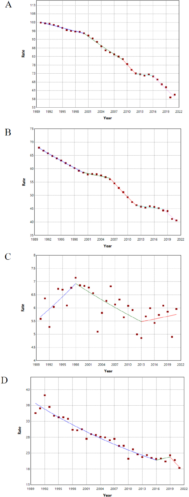 The trend in cardiovascular mortality rates attributable to high temperatures varied across three segments, with some periods showing positive annual percentage changes and others negative ones. Among men, only the trend from 1998 to 2013 was significant, showing a decline in mortality rates due to high temperatures, with a yearly decrease of 1.54% (p-value = 0.007). In women, significant trend changes were observed in the segments from 1990 to 2009, with an annual increase of 3.58% in mortality rates from 1990 to 1998, followed by a yearly decrease of 3.13% in cardiovascular mortality rates due to high temperatures from 1998 to 2009 (Table 1, Figs. 5A-D and 6A-D). Moreover, the average annual changes in mortality rates attributable to high temperatures from 1990 to 2021 and from 2012 to 2021 showed an increasing trend, although this increase was not statistically significant (Table 2).